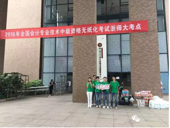 初秋的天氣溫和宜人,2016年全國(guó)會(huì)計(jì)專業(yè)技術(shù)中級(jí)資格考試今天開(kāi)始啦!浙江師范大學(xué)考點(diǎn)的考生們陸續(xù)趕到考場(chǎng),準(zhǔn)備開(kāi)始今天的考試。金華金辰軟件有限公司的小伙伴們已經(jīng)早早的在浙師大考點(diǎn),為每位考生加油!