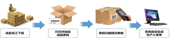成品完工下線(xiàn)時(shí),將成品條碼打印并粘貼到包裝上,倉(cāng)庫(kù)人員先掃描生產(chǎn)訂單,并逐一掃描成品條碼,系統(tǒng)自動(dòng)關(guān)聯(lián)生產(chǎn)匯報(bào)單生成產(chǎn)品入庫(kù)單。